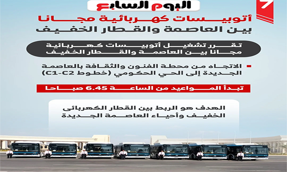13 نوفمبر 2025 النقل تشغل أتوبيسات كهربائية مجانا لربط أحياء العاصمة بالقطار الخفيف LRT بواسطة: اليوم السابع https://www.youm7.com/story/2025/11/13/%D8%A7%D9%84%D9%86%D9%82%D9%84-%D8%AA%D8%B4%D8%BA%D9%84-%D8%A3%D8%AA%D9%88%D8%A8%D9%8A%D8%B3%D8%A7%D8%AA-%D9%83%D9%87%D8%B1%D8%A8%D8%A7%D8%A6%D9%8A%D8%A9-%D9%85%D8%AC%D8%A7%D9%86%D8%A7-%D9%84%D8%B1%D8%A8%D8%B7-%D8%A3%D8%AD%D9%8A%D8%A7%D8%A1-%D8%A7%D9%84%D8%B9%D8%A7%D8%B5%D9%85%D8%A9-%D8%A8%D8%A7%D9%84%D9%82%D8%B7%D8%A7%D8%B1-%D8%A7%D9%84%D8%AE%D9%81%D9%8A%D9%81/7195691 413 أكدت شركة أكتا، التابعة لـ وزارة النقل، أنه حرصاً على راحة المواطنين من قاطني العاصمة الجديدة وكذا العاملين بها تقرر تشغيل أتوبيسات العاصمة المتجهة من محطة القطار الخفيف (LRT) بمحطة الفنون والثقافة بالعاصمة الجديدة إلى الحي الحكومي.